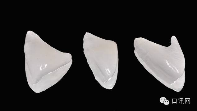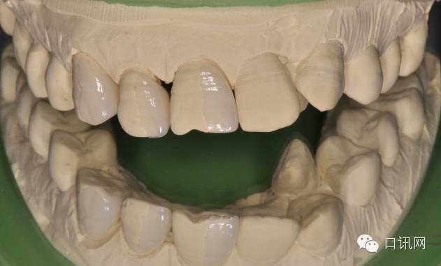 治疗计划:在仔细检查了患者前伸合和侧方合关系后,建议超薄烤瓷贴面修复散在牙间隙,制作诊断蜡型,前后对比效果利于患者提前知晓预后,但患者暂不考虑修复23远中缝隙