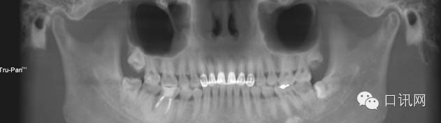 X片显示:11,12,13,21,22,23根充物欠填4-5mm口腔临床执业医师。12根尖阴影大 约3.3*5.5mm口腔医学技术。11,13,21,22根尖有阴影口腔修复工艺。